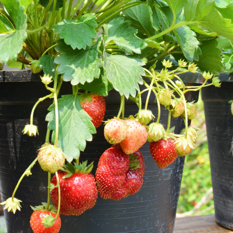 Strawberries are compact, quick to fruit, and perfect for hanging baskets or railing planters. Plus, kids love them!