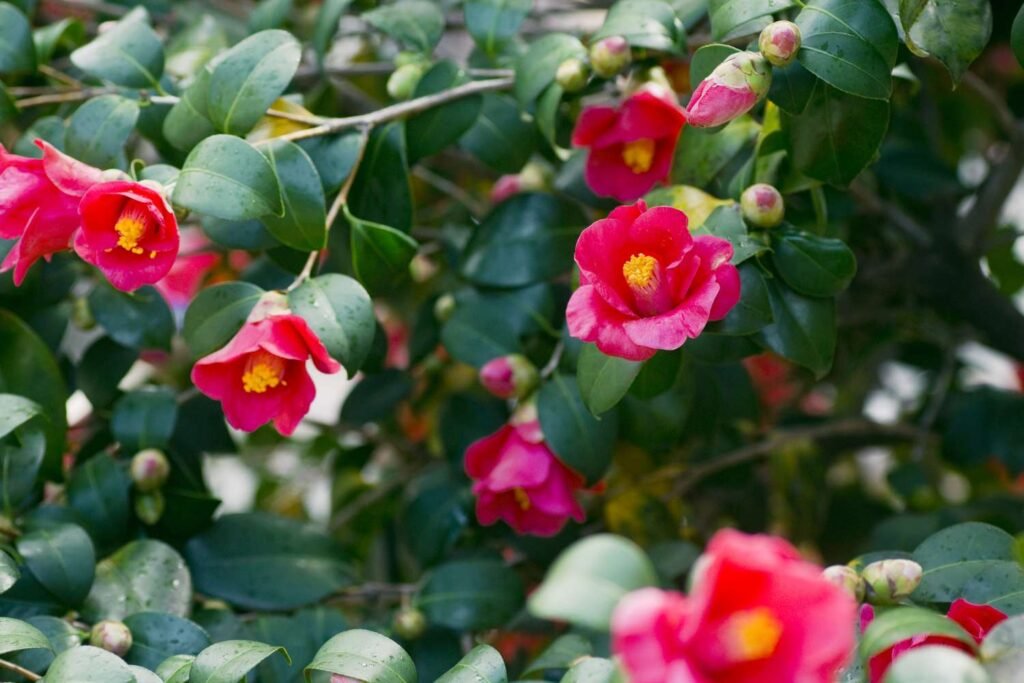 Camellias are prized for their rose-like blooms that open in shades of pink, red, or white from late fall through winter.