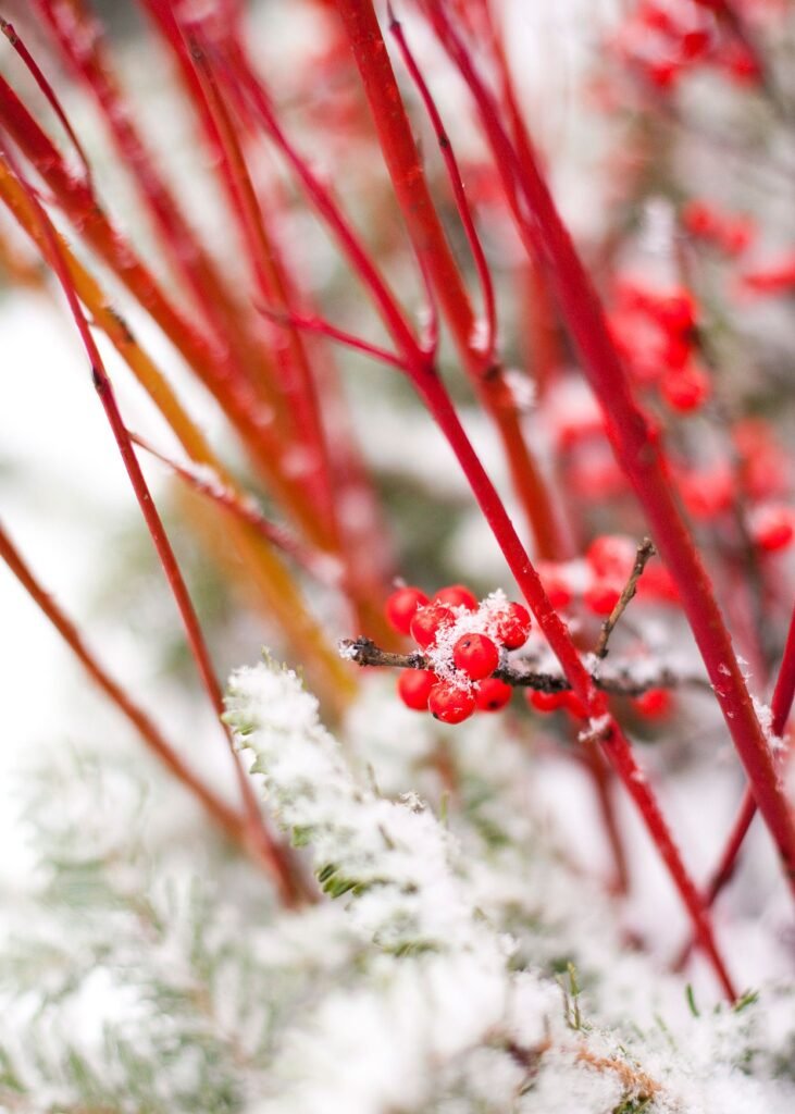- Pair vibrant stems (like red twig dogwood) with evergreens (like boxwood).