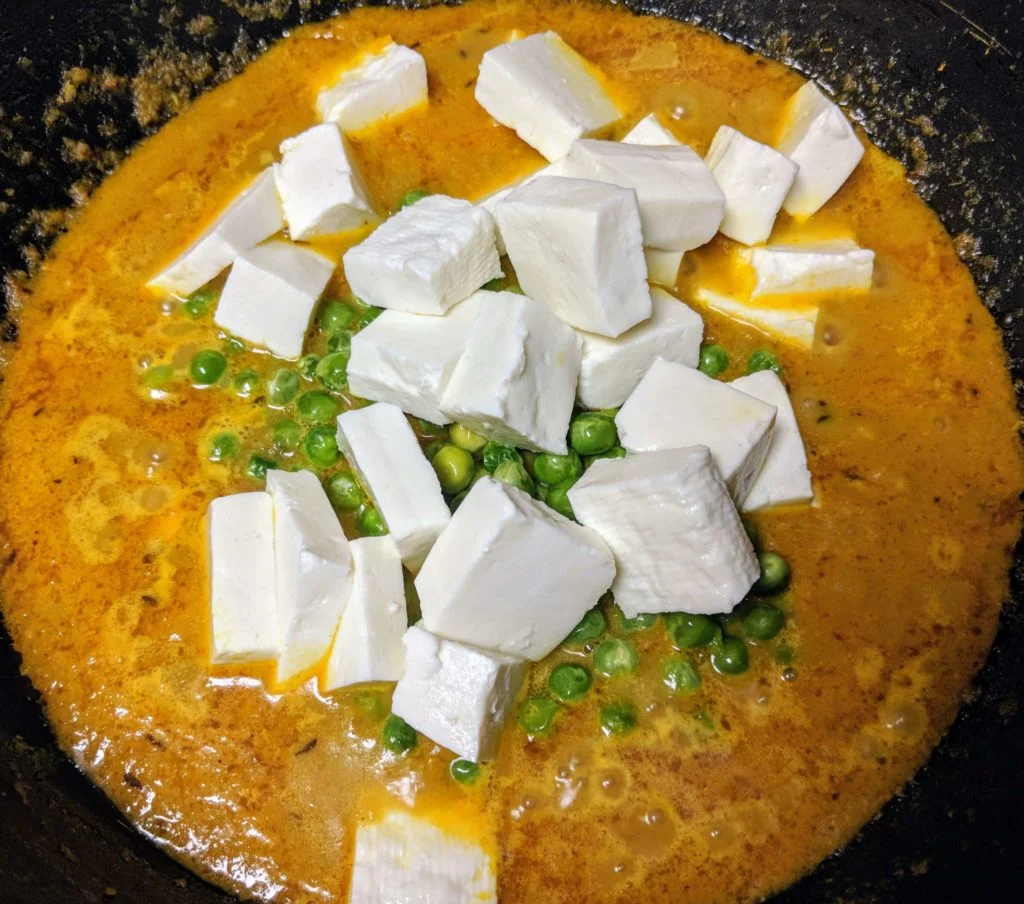 Once your masala base is perfectly spiced and thick, it’s time to bring in the stars — matar (peas) and paneer.