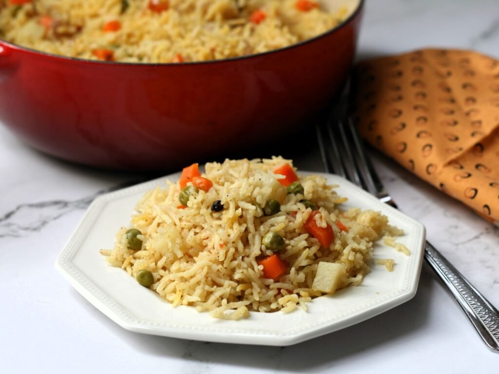 Tip: Layering ensures the flavors blend while keeping the rice fluffy and separate.