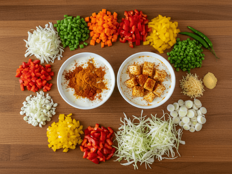 While the noodles cook, wash, peel, and slice all vegetables uniformly. Julienne carrots, thinly slice bell peppers, chop broccoli into bite-sized florets, and trim baby corn and snap peas. Uniform cutting ensures even cooking and a professional-looking dish.