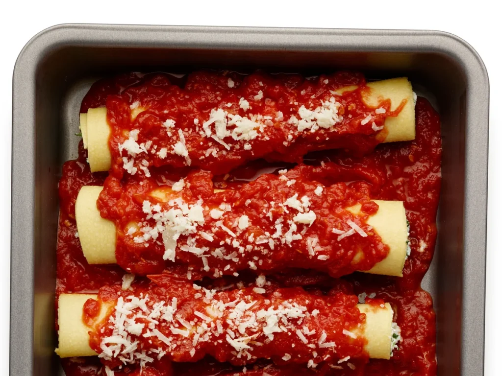- Place the filled tubes seam-side down in a greased baking dish coated with a thin layer of sauce.