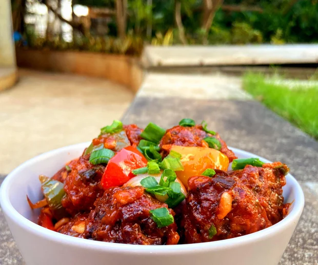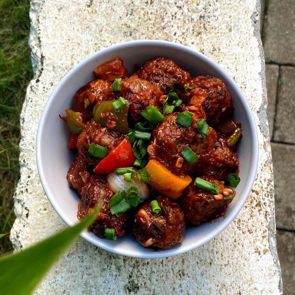 These crispy Manchurian balls are flavorful enough to eat as snacks — but the real magic happens once they’re coated in the spicy, tangy sauce.